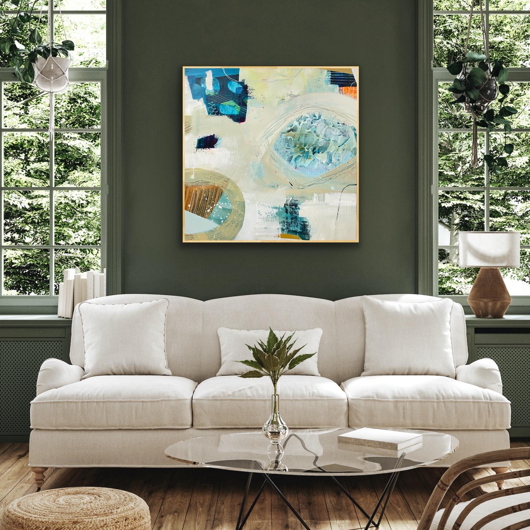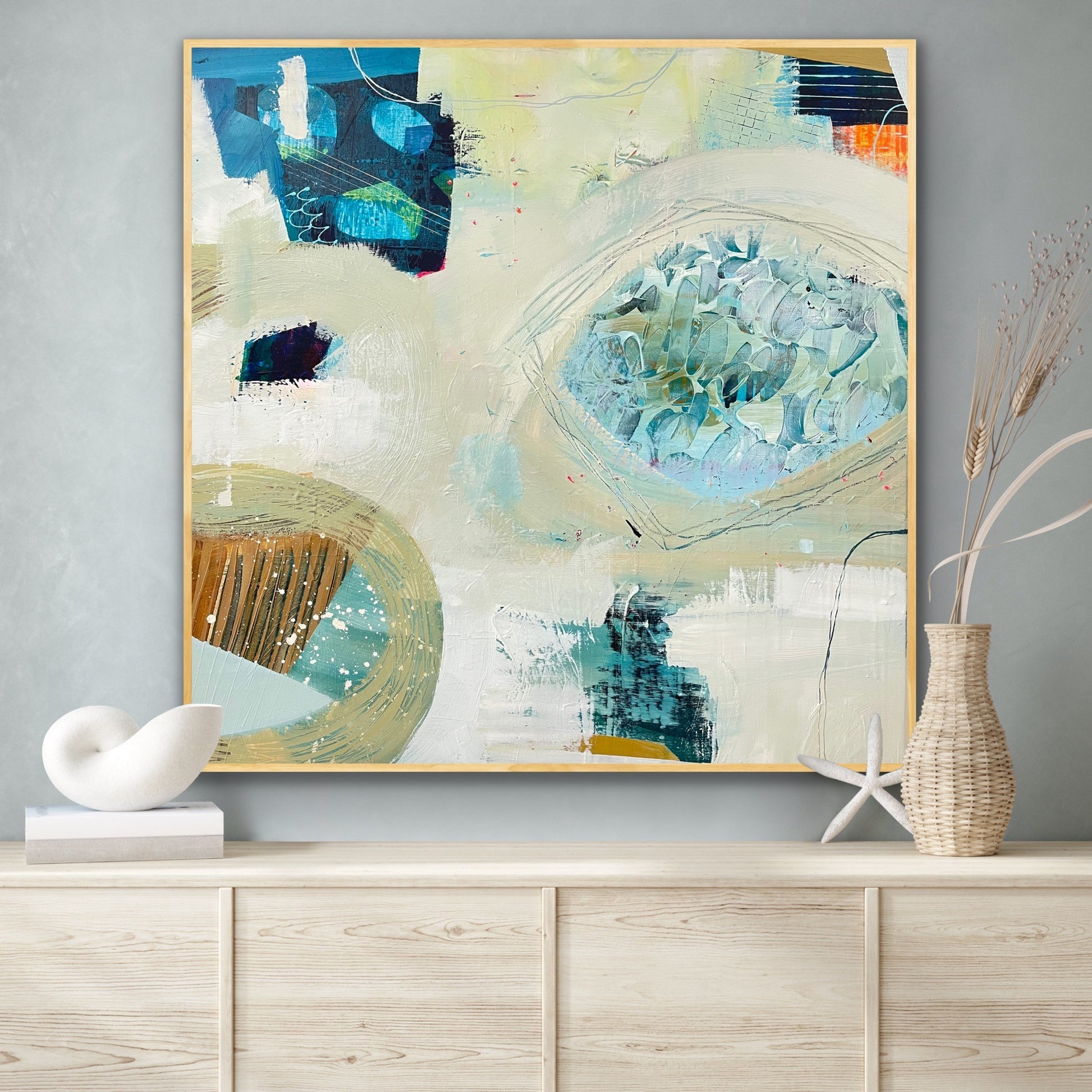 ‘Beachcombing’ Art Print on Canvas draws you to the shoreline, where each tide reveals hidden treasures to discover. Soft washes of pale sand and seafoam green flow across the canvas. Organic shapes evoke sun-bleached driftwood, smooth pebbles, and shards of sea glass. Pools of layered turquoise and delicate textures capture the shifting play of water and light. Rich navy, inky black, and bright coral accents highlight the unexpected flotsam that stands out along the muted shore. Circular forms and sweeping lines trace the tides as they pull and release, echoing nature’s rhythm. This painting creates a contemplative escape – a moment to pause, explore, and uncover beauty in overlooked details.